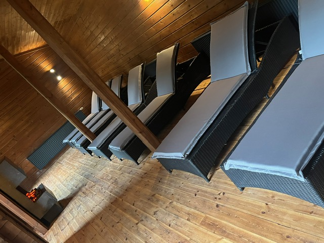 Die geräumige, mit Keloholz ausgestattete Blockhaussauna im Saunagarten, ist unsere größte und auch wärmste Sauna. Hier kommen Freunde des Aufgießens voll auf ihre Kosten, da unser Personal genug Platz hat um jeden Saunagast ausreichend mit heißer Luft zu bedienen.